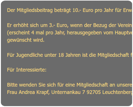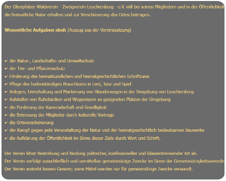 Oberpfälzer Waldverein - Zweigverein Leuchtenberg - e.V.Vorsitzende Andrea KrapfUnternankau 792705 LeuchtenbergTel: 09659-Email: info@owv-leuchtenberg.deWebsite: www.owv-leuchtenberg.de